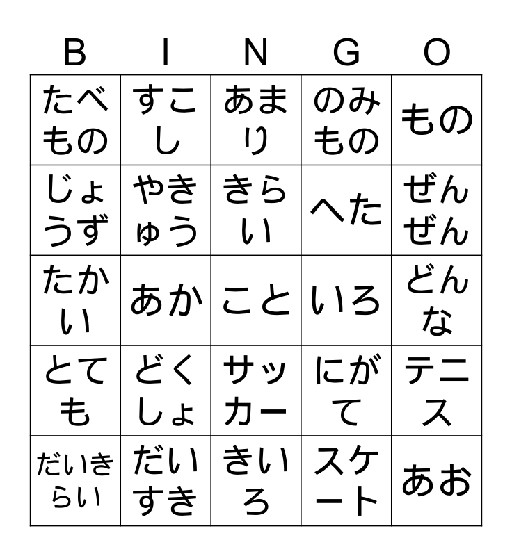 This bingo card has a free space and 24 words: どくしょ, だいすき, きらい, だいきらい, もの, たべもの, じょうず, すこし, いろ, サッカー, へた, たかい, にがて, テニス, やきゅう, スケート, どんな, あまり, ぜんぜん, あか, あお, とても, のみもの and きいろ.