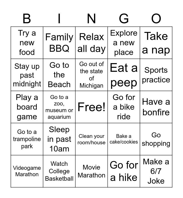 This bingo card has a free space and 25 words: Sleep in past 10am, Movie Marathon, Go out of the state of Michigan, Videogame Marathon, Take a nap, Try a new food, Stay up past midnight, Family BBQ, Go for a bike ride, Clean your room/house, Eat a peep, Play a board game, Bake a cake/cookies, Go shopping, Go to the Beach, Go to a Pistons, Tigers or Red Wings game, Have a bonfire, Relax all day, Sports practice, Go to a zoo, museum or aquarium, Make a 6/7 Joke, Watch College Basketball, Go to a trampoline park, Explore a new place and Go for a hike.