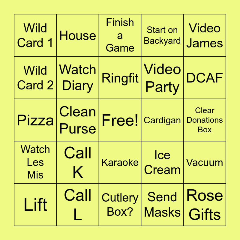 This bingo card has a free space and 24 words: Call K, Call L, Ringfit, Lift, Video James, Wild Card 1, Wild Card 2, House, Cardigan, Karaoke, Video Party, Pizza, Ice Cream, Vacuum, Watch Diary, Send Masks, Clear Donations Box, Finish a Game, DCAF, Clean Purse, Rose Gifts, Watch Les Mis, Start on Backyard and Cutlery Box?.