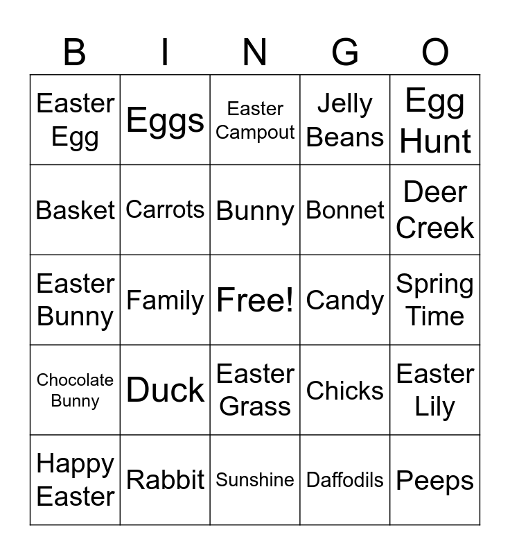 This bingo card has a free space and 24 words: Duck, Rabbit, Bunny, Happy Easter, Egg Hunt, Easter Egg, Basket, Eggs, Candy, Easter Grass, Bonnet, Easter Bunny, Chicks, Easter Lily, Carrots, Daffodils, Spring Time, Easter Campout, Deer Creek, Family, Peeps, Chocolate Bunny, Jelly Beans and Sunshine.