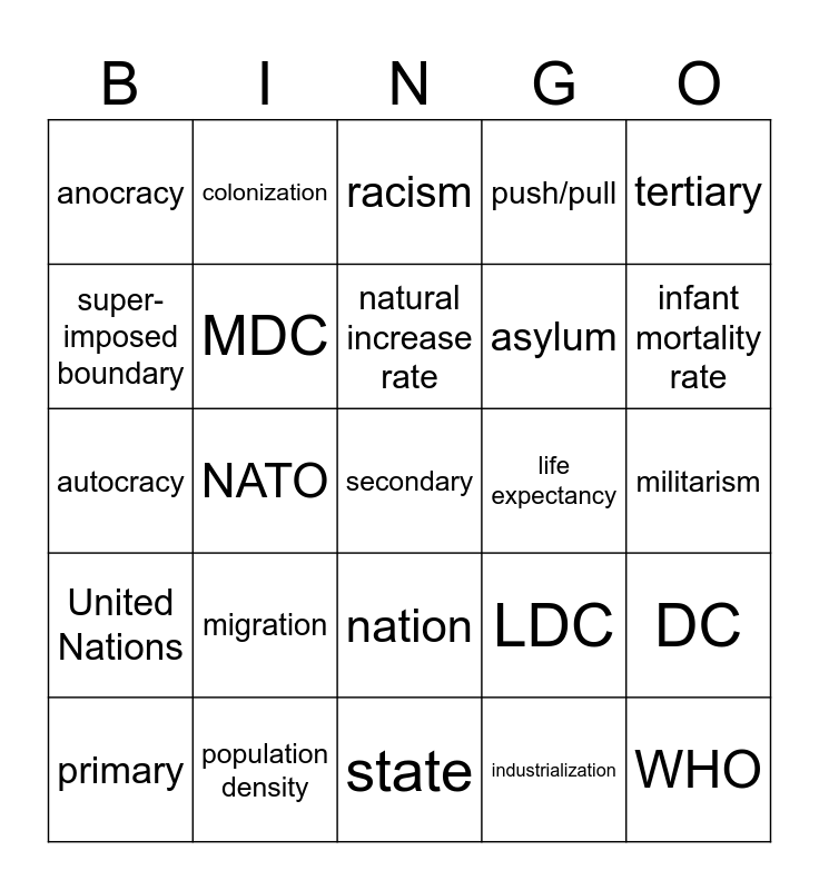 This bingo card has a free space and 24 words: migration, population density, natural increase rate, primary, tertiary, anocracy, super-imposed boundary, colonization, life expectancy, nation, asylum, autocracy, LDC, DC, MDC, industrialization, militarism, racism, infant mortality rate, NATO, WHO, United Nations, push/pull and state.
