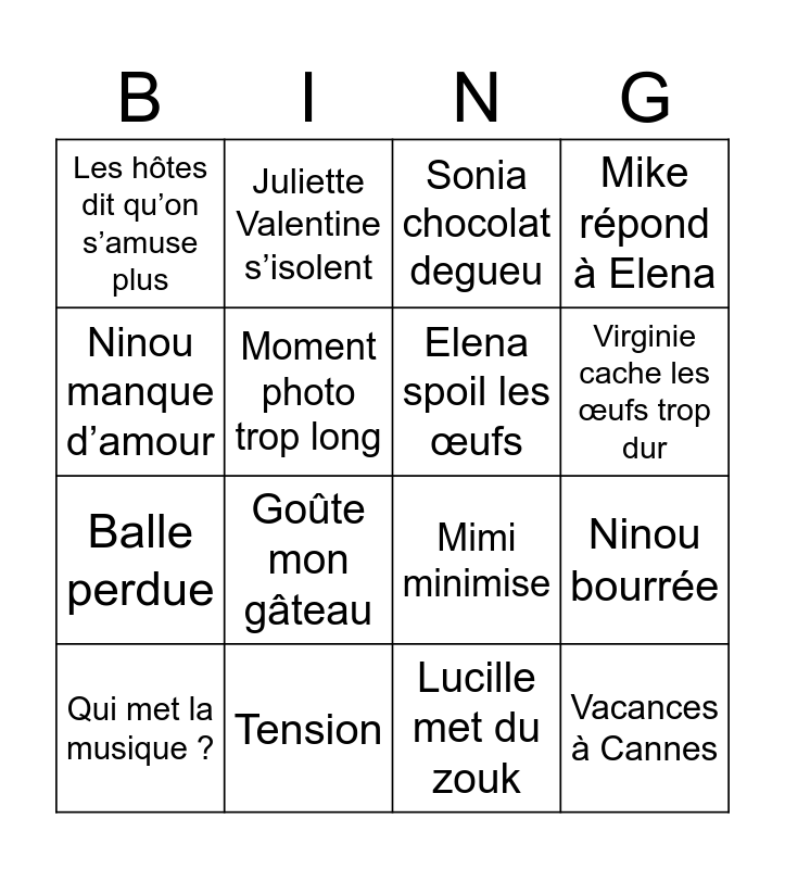 This bingo card has 16 words: Tension, Ninou bourrée, Sonia chocolat degueu, Les hôtes dit qu’on s’amuse plus, Balle perdue, Juliette Valentine s’isolent, Mimi minimise, Lucille met du zouk, Ninou manque d’amour, Moment photo trop long, Qui met la musique ?, Mike répond à Elena, Goûte mon gâteau, Virginie cache les œufs trop dur, Elena spoil les œufs and Vacances à Cannes.