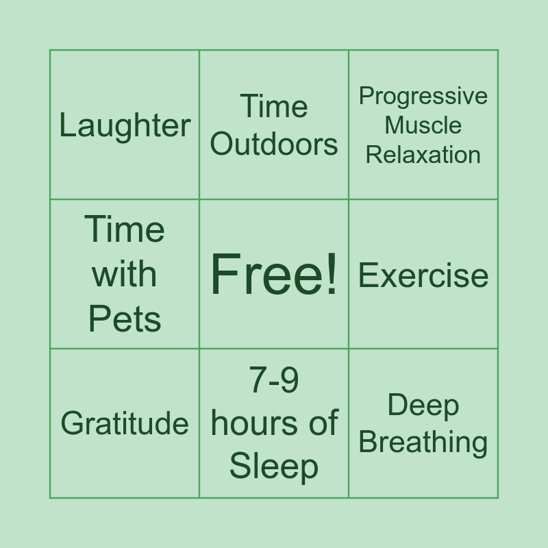 This bingo card has a free space and 8 words: Exercise, Progressive Muscle Relaxation, Time Outdoors, Gratitude, Laughter, Deep Breathing, Time with Pets and 7-9 hours of Sleep.