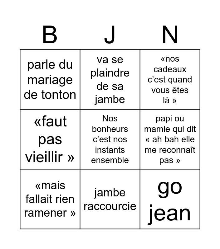 This bingo card has 9 words: «mais fallait rien ramener », «nos cadeaux c’est quand vous êtes là », va se plaindre de sa jambe, «faut pas vieillir », parle du mariage de tonton, papi ou mamie qui dit « ah bah elle me reconnaît pas », Nos bonheurs c’est nos instants ensemble, go jean and jambe raccourcie.