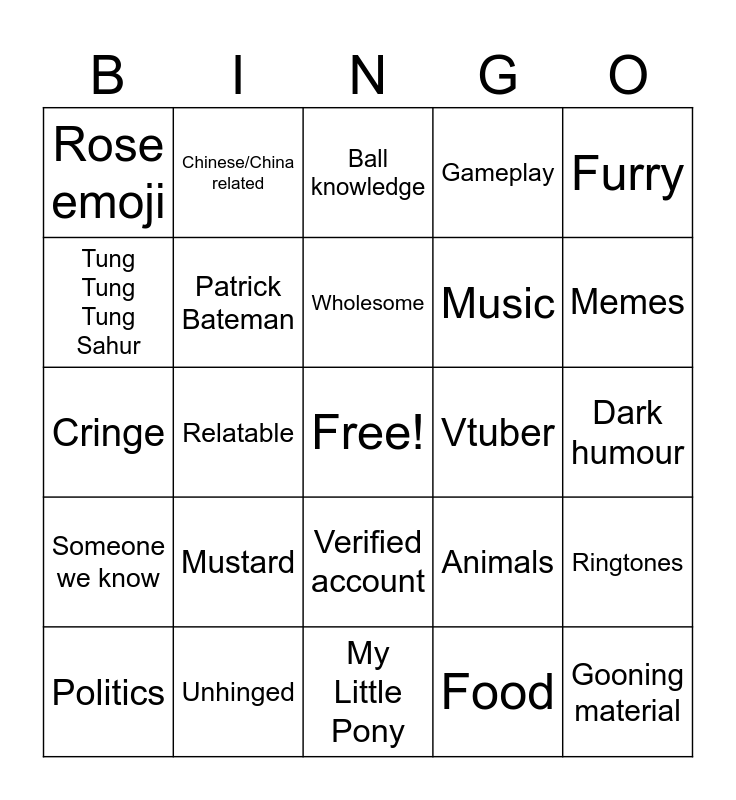 This bingo card has a free space and 24 words: Mustard, Unhinged, Wholesome, Politics, Furry, Rose emoji, Tung Tung Tung Sahur, Chinese/China related, Vtuber, Verified account, Music, Cringe, Animals, Ringtones, Patrick Bateman, Food, Dark humour, Ball knowledge, Memes, Relatable, Gooning material, Someone we know, Gameplay and My Little Pony.