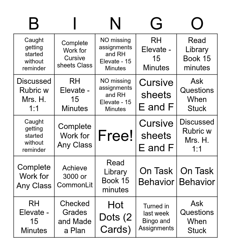 ⚠ This card has duplicate items: Ask Questions When Stuck (2), Hot Dots (2 Cards) (4), Achieve 3000 or CommonLit (2), Complete Work for Any Class (4), Reviewed Academic Skills Rubric (2), Discussed Rubric w Mrs. H. 1:1 (2), RH Elevate - 15 Minutes (6), On Task Behavior (8), NO missing assignments and RH Elevate - 15 Minutes (2), Cursive sheets E and F (2), Cursive sheets G and H (2), Read Library Book 15 minutes (3), Caught getting started without reminder (2)