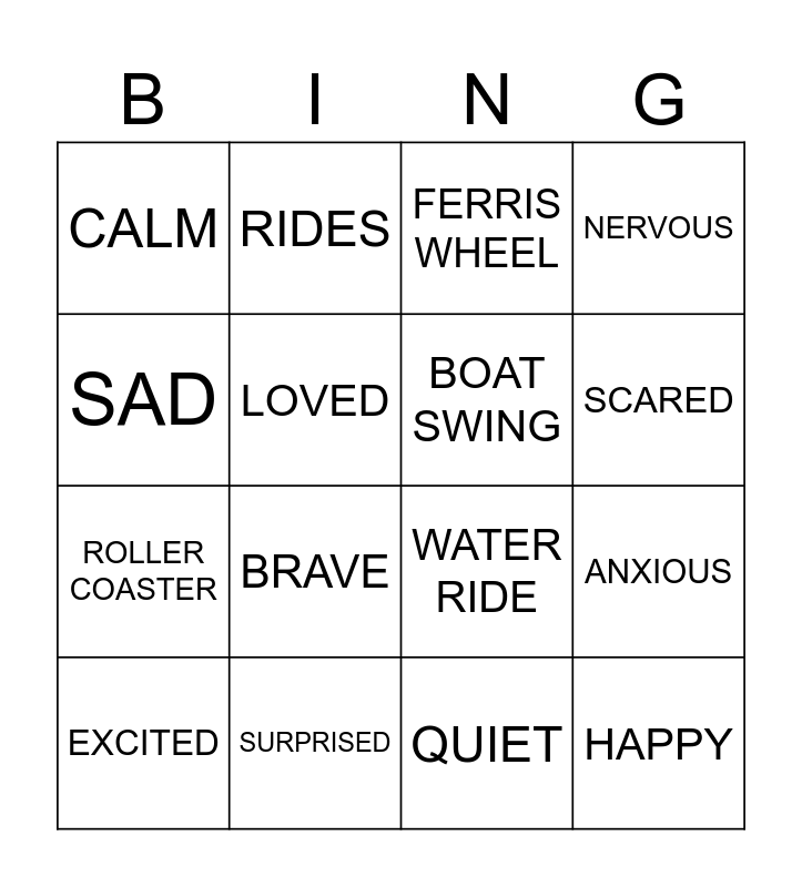 This bingo card has 23 words: HAPPY, HUNGRY, SCARED, AMUSEMENT PARK, SAD, CALM, LOVED, RIDES, EXCITED, SLEEPY, BRAVE, ROLLER COASTER, ANGRY, TIRED, SURPRISED, BUMPER CARS, FERRIS WHEEL, WATER RIDE, BOAT SWING, ANXIOUS, NERVOUS, QUIET and OKAY.