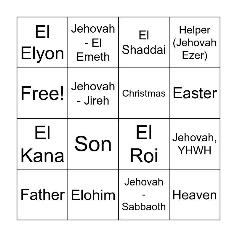 This bingo card has 16 words: Elohim, Jehovah, YHWH, El Shaddai, El Elyon, El Kana, Jehovah - El Emeth, El Roi, Jehovah - Sabbaoth, Free!, Jehovah - Jireh, Father, Helper (Jehovah Ezer), Son, Easter, Christmas and Heaven.