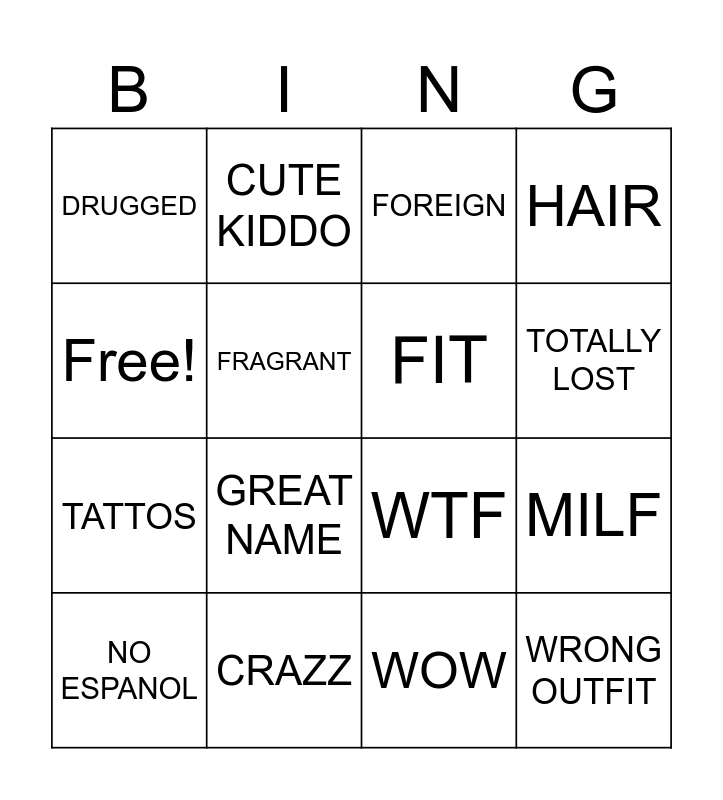 This bingo card has 16 words: CRAZZ, MILF, FOREIGN, DRUGGED, TATTOS, CUTE KIDDO, WTF, WOW, Free!, FRAGRANT, NO ESPANOL, HAIR, GREAT NAME, TOTALLY LOST, FIT and WRONG OUTFIT.