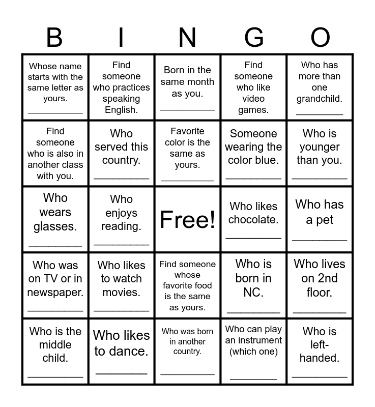 This bingo card has a free space and 29 words: Has an older brother. _______, Who likes to dance. _______, Born in the same month as you. __________, Who likes to cook. ________, Who has more than one grandchild. _________, Whose name starts with the same letter as yours. ___________, Who served this country. _________, Favorite color is the same as yours. __________, Who likes chocolate. _________, Who lives on 2nd floor. ________, Who is the middle child. _________, Who enjoys reading. _________, Who can play an instrument (which one) _________, Who is left-handed. _________, Who wears glasses. ________, Someone who knits/crochets __________, Who was born in another country. ____________, Who is born in NC. ________, Who is younger than you. _________, Who was on TV or in newspaper. _________, Who likes to watch movies. _________, Who has moved in after February __________, Someone wearing the color blue. _________, Who has a pet ________, Find someone who is also in another class with you., Find someone who practices speaking English., Find someone whose favorite food is the same as yours., Find someone who like video games. and Find someone who knows how to conjugate "to be.".