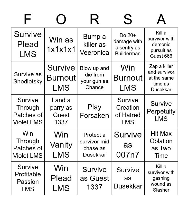 Forsaken Bingo (Win=killer, survive=survivor) | FORSAKEN | FORSAKEN | Forsaken bingo | Forsaken bingo