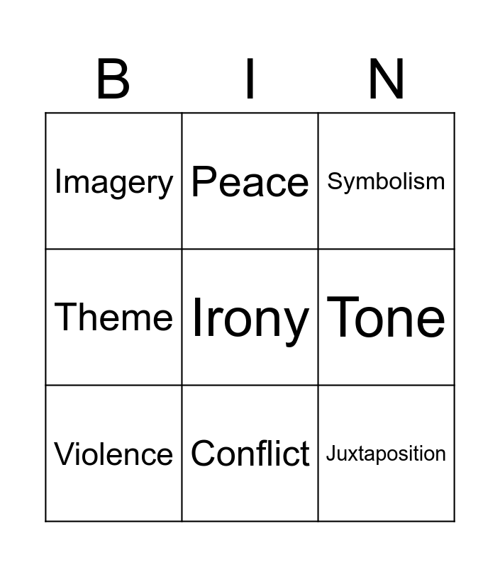 This bingo card has 9 words: Violence, Irony, Symbolism, Imagery, Peace, Tone, Theme, Conflict and Juxtaposition.