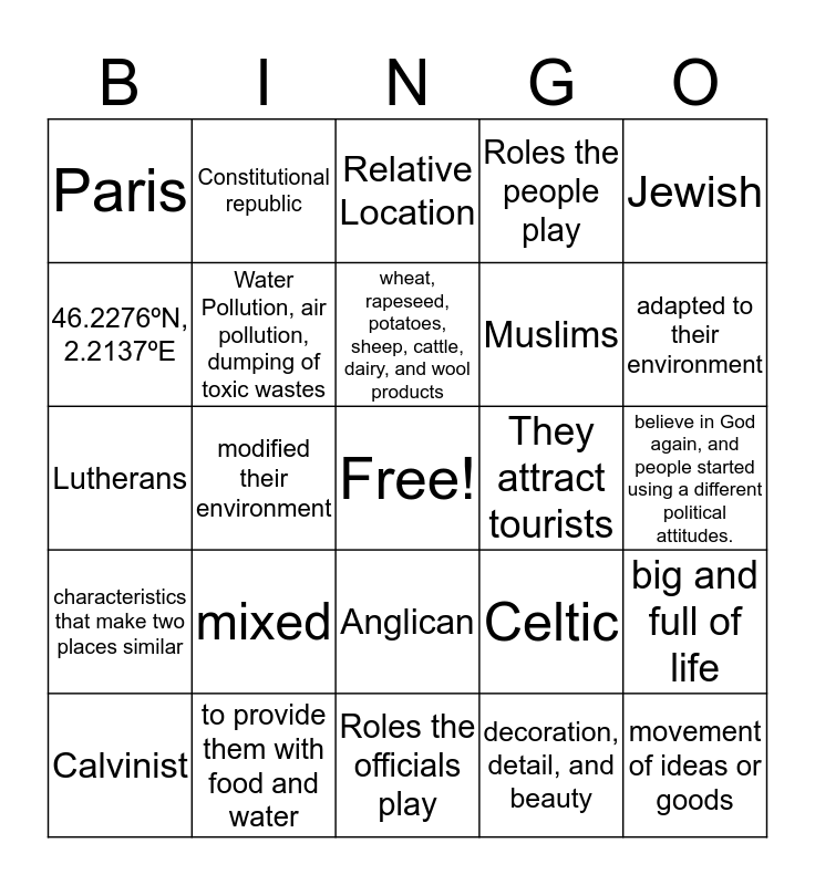 This bingo card has a free space and 24 words: mixed, to provide them with food and water, wheat, rapeseed, potatoes, sheep, cattle, dairy, and wool products, Calvinist, Jewish, Paris, 46.2276ºN, 2.2137ºE, Constitutional republic, They attract tourists, Anglican, Muslims, Lutherans, Celtic, big and full of life, Water Pollution, air pollution, dumping of toxic wastes, decoration, detail, and beauty, believe in God again, and people started using a different political attitudes., Relative Location, adapted to their environment, modified their environment, movement of ideas or goods, characteristics that make two places similar, Roles the people play and Roles the officials play.