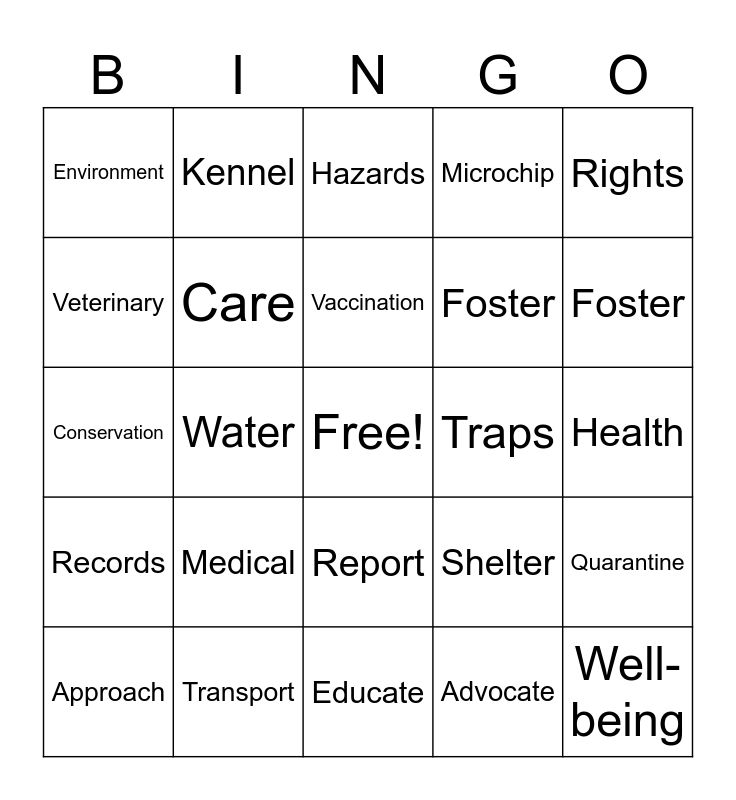 This bingo card has a free space and 29 words: Approach, Food, Water, Contact, Environment, Hazards, Care, Medical, Traps, Transport, Health, Well-being, Educate, Advocate, Foster, Adopt, Report, Records, Rights, Conservation, Shelter, Rescue, Foster, Veterinary, Microchip, Kennel, Quarantine, Vaccination and Neuter.