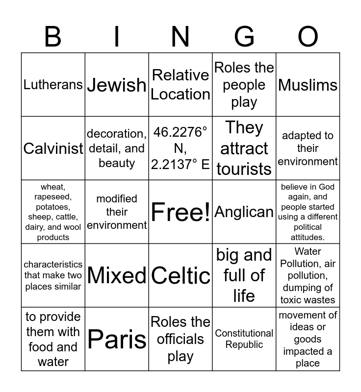 This bingo card has a free space and 24 words: Mixed, Paris, 46.2276° N, 2.2137° E, to provide them with food and water, Muslims, Lutherans, Calvinist, Jewish, Anglican, Celtic, They attract tourists, wheat, rapeseed, potatoes, sheep, cattle, dairy, and wool products, big and full of life, Water Pollution, air pollution, dumping of toxic wastes, decoration, detail, and beauty, Constitutional Republic, believe in God again, and people started using a different political attitudes., Relative Location, adapted to their environment, modified their environment, movement of ideas or goods impacted a place, characteristics that make two places similar, Roles the people play and Roles the officials play.