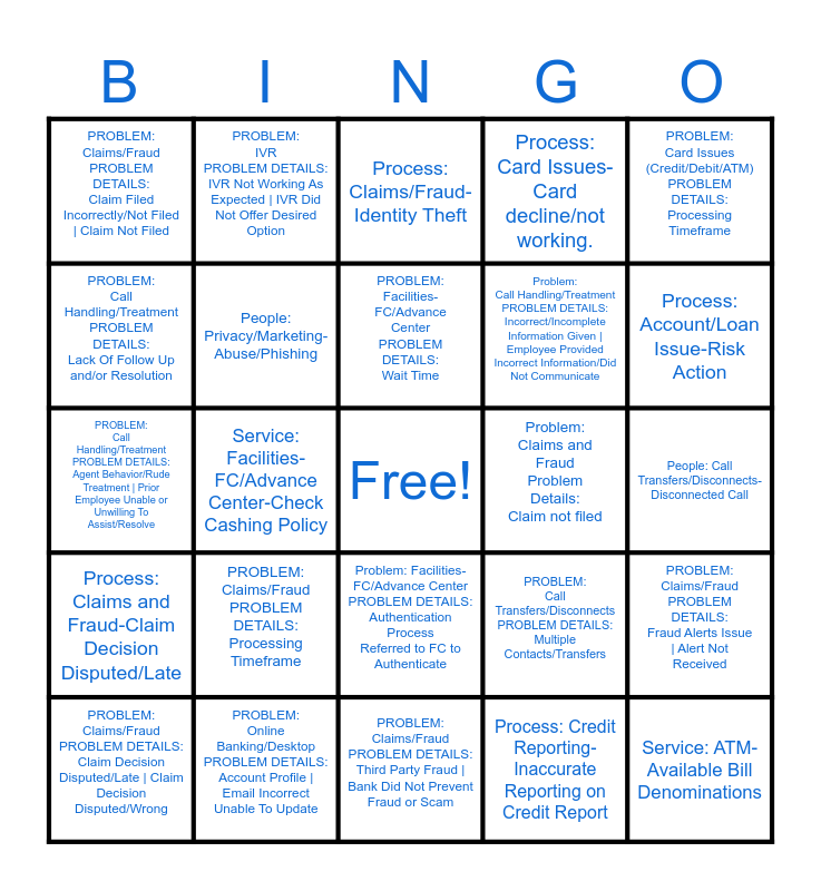 This bingo card has a free space and 24 words: PROBLEM: Claims/Fraud PROBLEM DETAILS: Processing Timeframe, PROBLEM: Online Banking/Desktop PROBLEM DETAILS: Account Profile | Email Incorrect Unable To Update, PROBLEM: Facilities- FC/Advance Center PROBLEM DETAILS: Wait Time, PROBLEM: Claims/Fraud PROBLEM DETAILS: Claim Decision Disputed/Late | Claim Decision Disputed/Wrong, PROBLEM: Card Issues (Credit/Debit/ATM) PROBLEM DETAILS: Processing Timeframe, PROBLEM: Claims/Fraud PROBLEM DETAILS: Claim Filed Incorrectly/Not Filed | Claim Not Filed, PROBLEM: Call Handling/Treatment PROBLEM DETAILS: Lack Of Follow Up and/or Resolution, PROBLEM: IVR PROBLEM DETAILS: IVR Not Working As Expected | IVR Did Not Offer Desired Option, Problem: Claims and Fraud Problem Details: Claim not filed, Problem: Facilities- FC/Advance Center PROBLEM DETAILS: Authentication Process Referred to FC to Authenticate, Problem: Call Handling/Treatment PROBLEM DETAILS: Incorrect/Incomplete Information Given | Employee Provided Incorrect Information/Did Not Communicate, PROBLEM: Call Handling/Treatment PROBLEM DETAILS: Agent Behavior/Rude Treatment | Prior Employee Unable or Unwilling To Assist/Resolve, PROBLEM: Call Transfers/Disconnects PROBLEM DETAILS: Multiple Contacts/Transfers, PROBLEM: Claims/Fraud PROBLEM DETAILS: Fraud Alerts Issue | Alert Not Received, People: Privacy/Marketing- Abuse/Phishing, Process: Credit Reporting- Inaccurate Reporting on Credit Report, People: Call Transfers/Disconnects- Disconnected Call, Process: Claims/Fraud- Identity Theft, Process: Account/Loan Issue-Risk Action, Service: Facilities- FC/Advance Center-Check Cashing Policy, Service: ATM-Available Bill Denominations, Process: Claims and Fraud-Claim Decision Disputed/Late, Process: Card Issues- Card decline/not working. and PROBLEM: Claims/Fraud PROBLEM DETAILS: Third Party Fraud | Bank Did Not Prevent Fraud or Scam.