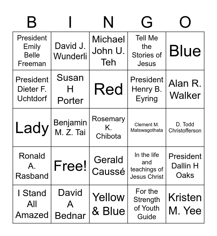 This bingo card has 25 words: Free!, Yellow & Blue, Red, I Stand All Amazed, Blue, President Emily Belle Freeman, President Dieter F. Uchtdorf, David J. Wunderli, Clement M. Matswagothata, Gerald Caussé, President Henry B. Eyring, Lady, In the life and teachings of Jesus Christ, President Dallin H Oaks, Susan H Porter, Kristen M. Yee, D. Todd Christofferson, Michael John U. Teh, Alan R. Walker, Benjamin M. Z. Tai, Rosemary K. Chibota, David A Bednar, Ronald A. Rasband, Tell Me the Stories of Jesus and For the Strength of Youth Guide.