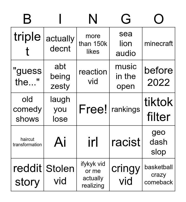 This bingo card has a free space and 24 words: Ai, Stolen vid, reaction vid, reddit story, minecraft, triple t, "guess the...", actually decnt, rankings, irl, music in the open, old comedy shows, racist, geo dash slop, abt being zesty, cringy vid, tiktok filter, more than 150k likes, before 2022, laugh you lose, basketball crazy comeback, haircut transformation, sea lion audio and ifykyk vid or me actually realizing.