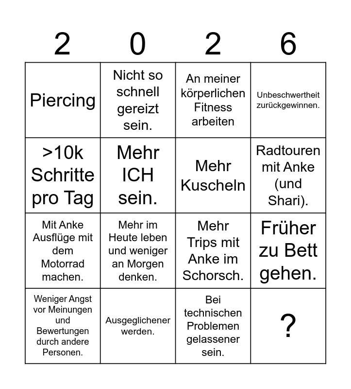This bingo card has 16 words: Ausgeglichener werden., Früher zu Bett gehen., An meiner körperlichen Fitness arbeiten, Piercing, Mit Anke Ausflüge mit dem Motorrad machen., Nicht so schnell gereizt sein., Mehr Trips mit Anke im Schorsch., Bei technischen Problemen gelassener sein., >10k Schritte pro Tag, Mehr ICH sein., Weniger Angst vor Meinungen und Bewertungen durch andere Personen., Unbeschwertheit zurückgewinnen., Mehr im Heute leben und weniger an Morgen denken., Radtouren mit Anke (und Shari)., Mehr Kuscheln and ?.