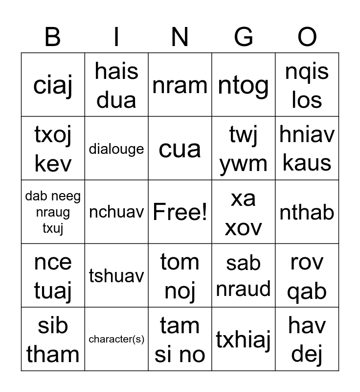 This bingo card has a free space and 41 words: dab neeg, dab neeg nraug txuj, setting, dialouge, character(s), tom noj, cua, qw, nqis los, nce tuaj, nchuav, ntog, hav dej, nthab, xa xov, tshuav, nkaum, ciaj, tsuag tsuag, nram, rov qab, hu, tam si no, twj ywm, ntsiag to, yuav mag, txhiaj, niam dab laug, hniav kaus, yawm vauv, hniav ntaj, hais dua, sib tham, qee leej, sab nraud, txoj kev, mob heev, nraub nrab, tsuj, tsuav and coj.