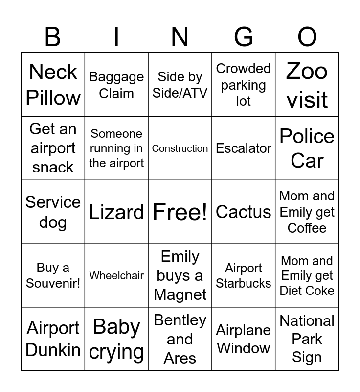 This bingo card has a free space and 27 words: Airport Starbucks, Snake, Escalator, Bentley and Ares, Get an airport snack, Side by Side/ATV, Baggage Claim, Buy a Souvenir!, Cactus, Mom and Emily get Diet Coke, Service dog, Crowded parking lot, Airport Dunkin, Baby crying, Police Car, Tumbleweed, Someone running in the airport, Construction, Wheelchair, Neck Pillow, Mom and Emily get Coffee, Airplane Window, Lizard, National Park Sign, Emily buys a Magnet, Zoo visit and "How much longer".