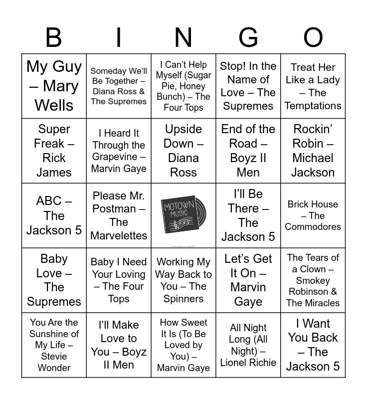 This bingo card has a free space and 38 words: Shop Around – The Miracles, My Girl – The Temptations, You Can’t Hurry Love – The Supremes, I Heard It Through the Grapevine – Marvin Gaye, The Tears of a Clown – Smokey Robinson & The Miracles, Baby I Need Your Loving – The Four Tops, Upside Down – Diana Ross, Give It to Me Baby – Rick James, Treat Her Like a Lady – The Temptations, End of the Road – Boyz II Men, Please Mr. Postman – The Marvelettes, Stop! In the Name of Love – The Supremes, I Want You Back – The Jackson 5, Brick House – The Commodores, Super Freak – Rick James, Baby Love – The Supremes, Superstition – Stevie Wonder, I Can’t Help Myself (Sugar Pie, Honey Bunch) – The Four Tops, Signed, Sealed, Delivered (I’m Yours) – Stevie Wonder, I’ll Be There – The Jackson 5, My Guy – Mary Wells, I’ll Make Love to You – Boyz II Men, Rockin’ Robin – Michael Jackson, You Are the Sunshine of My Life – Stevie Wonder, Reach Out I’ll Be There – The Four Tops, How Sweet It Is (To Be Loved by You) – Marvin Gaye, Three Times a Lady – The Commodores, Sail On – The Commodores, Easy – The Commodores, I’ll Be Around – The Spinners, Could It Be I’m Falling in Love – The Spinners, Working My Way Back to You – The Spinners, All Night Long (All Night) – Lionel Richie, Someday We’ll Be Together – Diana Ross & The Supremes, Ain’t No Mountain High Enough – Marvin Gaye & Tammi Terrell, Let’s Get It On – Marvin Gaye, ABC – The Jackson 5 and Ain’t Too Proud to Beg – The Temptations.