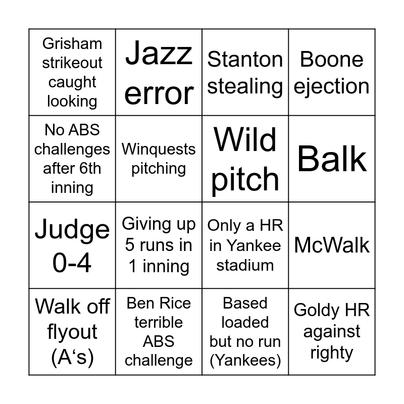 This bingo card has 16 words: Ben Rice terrible ABS challenge, McWalk, Stanton stealing, Grisham strikeout caught looking, Judge 0-4, Jazz error, Only a HR in Yankee stadium, Based loaded but no run (Yankees), No ABS challenges after 6th inning, Winquests pitching, Walk off flyout (A‘s), Boone ejection, Giving up 5 runs in 1 inning, Balk, Wild pitch and Goldy HR against righty.