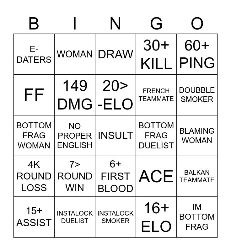 This bingo card has a free space and 24 words: 7> ROUND WIN, INSTALOCK DUELIST, 20> -ELO, 15+ ASSIST, 60+ PING, E-DATERS, FF, WOMAN, BOTTOM FRAG DUELIST, 6+ FIRST BLOOD, FRENCH TEAMMATE, BOTTOM FRAG WOMAN, ACE, BALKAN TEAMMATE, 149 DMG, 16+ ELO, BLAMING WOMAN, DRAW, DOUBBLE SMOKER, NO PROPER ENGLISH, IM BOTTOM FRAG, 4K ROUND LOSS, 30+ KILL and INSTALOCK SMOKER.