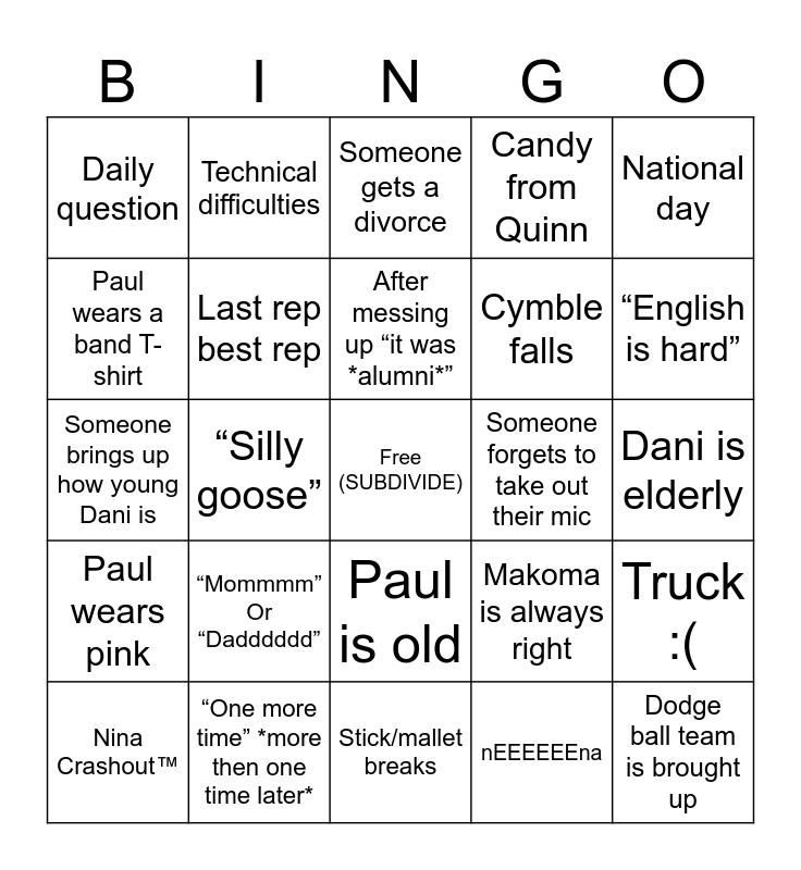 This bingo card has a free space and 24 words: “Mommmm” Or “Dadddddd”, “One more time” *more then one time later*, After messing up “it was *alumni*”, Nina Crashout™️, National day, Daily question, Paul wears a band T-shirt, Technical difficulties, Someone forgets to take out their mic, Paul is old, Cymble falls, Someone brings up how young Dani is, Makoma is always right, Truck :(, Last rep best rep, nEEEEEEna, Dani is elderly, Someone gets a divorce, “English is hard”, “Silly goose”, Dodge ball team is brought up, Paul wears pink, Candy from Quinn and Stick/mallet breaks.