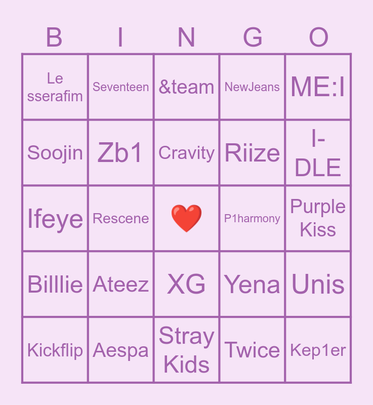 This bingo card has a free space and 52 words: Enhypen, Kep1er, Ahof, Stray Kids, Ateez, Nct, Seventeen, Ive, Soojin, GFRIEND, Zb1, Ald1, Unis, Yena, Kwon Eunbi, Bibi, Cravity, P1harmony, Close your eyes, ME:I, Rescene, Twice, Le sserafim, Riize, Hearts2hearts, Kiiikiii, StayC, Itzy, I-DLE, Nexz, Nmixx, NewJeans, Triples, Red velvet, TXT, &team, Aespa, Artms, Say my name, XLOV, TWS, Purple Kiss, Billlie, Fromis_9, XG, BOYNEXTDOOR, Viviz, Ifeye, Fifty fifty, Babymonster, Kickflip and Izna.