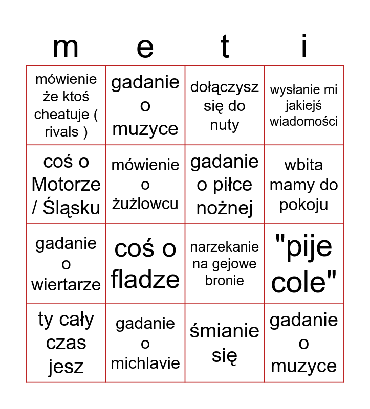 This bingo card has 16 words: gadanie o michlavie, "pije cole", dołączysz się do nuty, mówienie że ktoś cheatuje ( rivals ), gadanie o wiertarze, gadanie o muzyce, narzekanie na gejowe bronie, śmianie się, coś o Motorze / Śląsku, mówienie o żużlowcu, ty cały czas jesz, wysłanie mi jakiejś wiadomości, coś o fladze, wbita mamy do pokoju, gadanie o piłce nożnej and gadanie o muzyce.