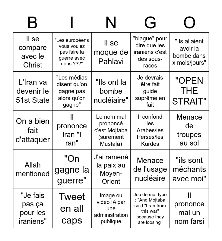 This bingo card has 25 words: "On gagne la guerre", Image ou vidéo IA par une administration publique, "Ils ont la bombe nucléiaire", "Je fais pas ça pour les iraniens", "Ils allaient avoir la bombe dans x mois/jours", Il se compare avec le Christ, L'Iran va devenir le 51st State, "Les européens vous voulez pas faire la guerre avec nous ???", Il confond les Arabes/les Perses/les Kurdes, J'ai ramené la paix au Moyen-Orient, Je devrais être fait guide suprême en fait, On a bien fait d'attaquer, Menace de l'usage nucléaire, "ils sont méchants avec moi", "Les médias disent qu'on gagne pas alors qu'on gagne", Il prononce mal un nom farsi, Menace de troupes au sol, Il se moque de Pahlavi, "OPEN THE STRAIT", Il prononce Iran "I ran", Le nom mal prononcé c'est Mojtaba (sûrement Mustafa), Tweet en all caps, Allah mentioned, "blague" pour dire que les iraniens c'est des sous-races and Jeu de mot type : "And Mojtaba said "I ran from this war" because they are loosing".