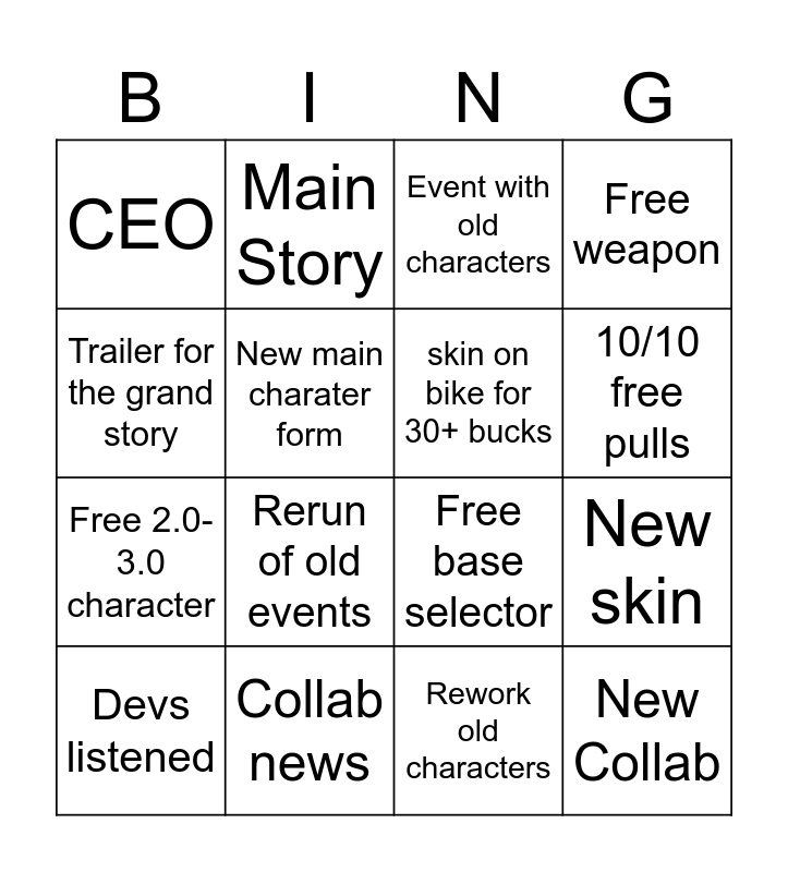 This bingo card has 16 words: Collab news, New skin, Event with old characters, CEO, Free 2.0-3.0 character, Main Story, Free base selector, Rework old characters, Trailer for the grand story, New main charater form, Devs listened, Free weapon, Rerun of old events, 10/10 free pulls, skin on bike for 30+ bucks and New Collab.