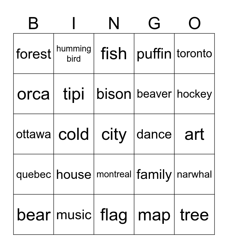 This bingo card has 29 words: bear, snow, cold, tree, forest, fish, tipi, house, dance, music, art, city, flag, map, hockey, maple, montreal, quebec, toronto, ottawa, family, inuit, beaver, orca, puffin, humming bird, narwhal, bison and buffalo.