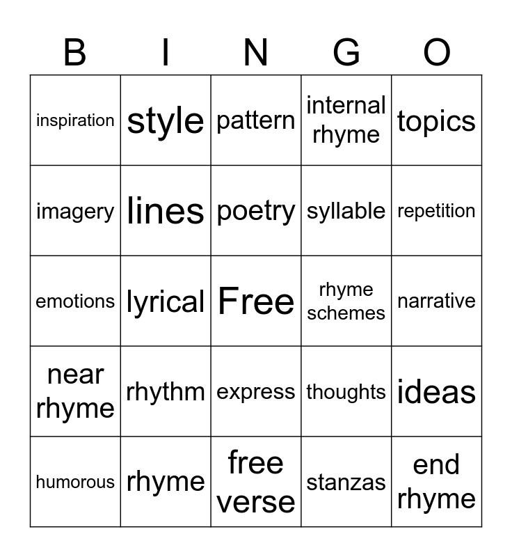 This bingo card has a free space and 24 words: rhythm, rhyme, poetry, humorous, topics, inspiration, imagery, style, rhyme schemes, express, syllable, emotions, thoughts, ideas, lines, stanzas, narrative, pattern, repetition, lyrical, end rhyme, near rhyme, internal rhyme and free verse.