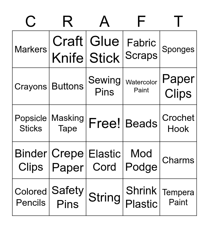 This bingo card has a free space and 84 words: Scissors, Pipe Cleaners, Glue Stick, Hot Glue Gun, Glue Dots, White Glue, Glitter, Sequins, Pom-Poms, Felt, Yarn, Ribbon, Buttons, Beads, Googly Eyes, Markers, Colored Pencils, Crayons, Paintbrush, Foam Brush, Acrylic Paint, Watercolor Paint, Tempera Paint, Washi Tape, Masking Tape, Double-Sided Tape, Stickers, Construction Paper, Cardstock, Tissue Paper, Crepe Paper, Craft Foam, Foam Stickers, Popsicle Sticks, Wooden Dowels, Twine, String, Rubber Bands, Paper Clips, Binder Clips, Clothespins, Hole Punch, Stapler, Staples, Ruler, Cutting Mat, Craft Knife, Self-Healing Mat, Stamps, Ink Pad, Stamp Block, Mod Podge, Fabric Scraps, Needle, Thread, Embroidery Floss, Safety Pins, Sewing Pins, Thimble, Crochet Hook, Knitting Needles, Fabric Scissors, Measuring Tape, Iron-On Vinyl, Transfer Tape, Glitter Glue, Paint Palette, Palette Knife, Sponges, Stencils, Charms, Jewelry Wire, Wire Cutters, Pliers, Elastic Cord, Shrink Plastic, Tracing Paper, Chalk Markers, Permanent Markers, Eraser, Pencil Sharpener, Sketchbook, Canvas and Mini Easel.