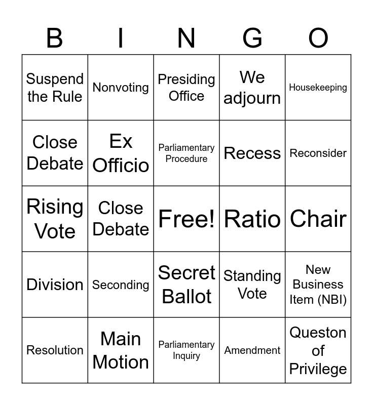 This bingo card has a free space and 32 words: Amendment, Bundle, Close Debate, Credential Card, Division, Ex Officio, Housekeeping, New Business Item (NBI), Nonvoting, Officer, Parliamentary Procedure, Presiding Office, Provision, Quorum, Ratio, Refer to Committee, Resolution, Rising Vote, Secret Ballot, Seconding, Standing Vote, Successor Delegate, Chair, Main Motion, Queston of Privilege, We adjourn, Recess, Close Debate, Suspend the Rule, Parliamentary Inquiry, Point of Order and Reconsider.