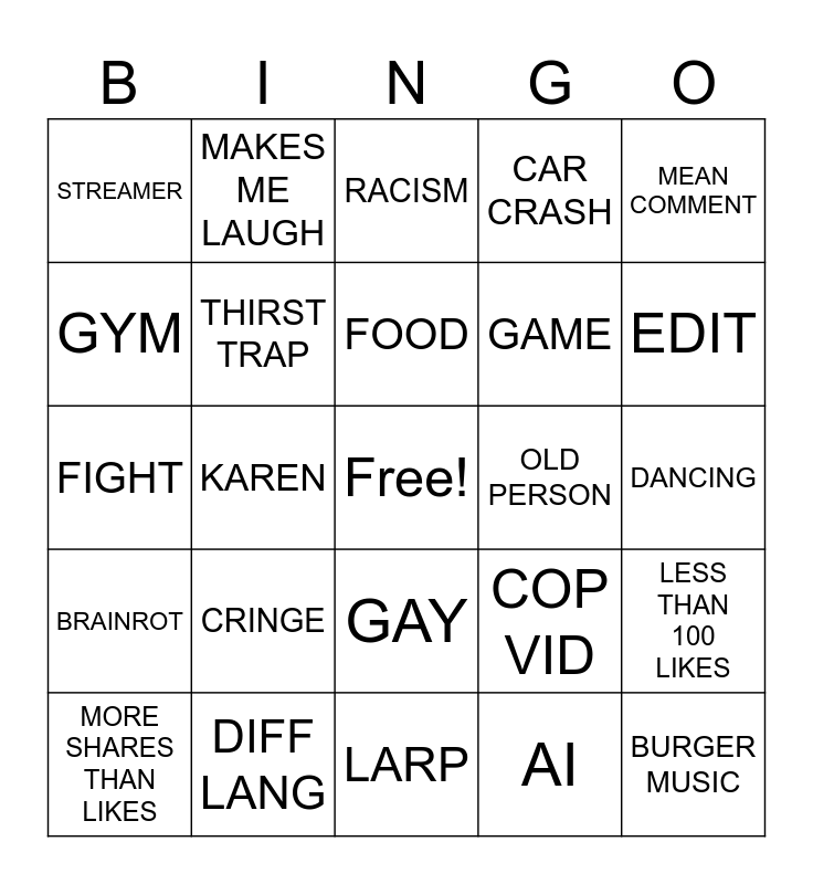 This bingo card has a free space and 24 words: CRINGE, DIFF LANG, FOOD, MORE SHARES THAN LIKES, MEAN COMMENT, STREAMER, GYM, MAKES ME LAUGH, OLD PERSON, GAY, GAME, FIGHT, COP VID, LESS THAN 100 LIKES, THIRST TRAP, AI, DANCING, RACISM, EDIT, KAREN, BURGER MUSIC, BRAINROT, CAR CRASH and LARP.