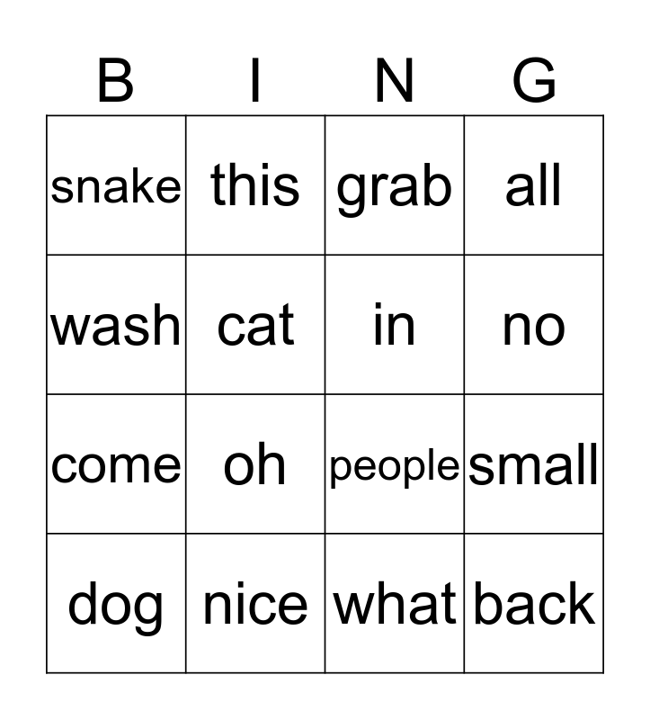 This bingo card has 16 words: nice, small, grab, snake, come, this, people, what, wash, cat, dog, all, oh, no, in and back.
