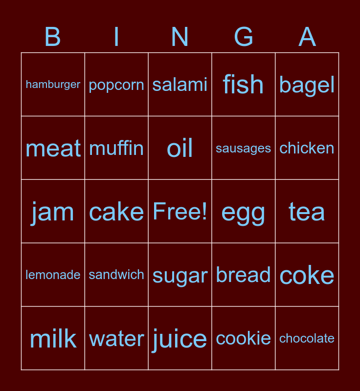 This bingo card has a free space and 24 words: sandwich, water, oil, milk, bagel, hamburger, meat, popcorn, egg, sugar, sausages, jam, bread, coke, muffin, cookie, tea, salami, chicken, cake, chocolate, lemonade, fish and juice.