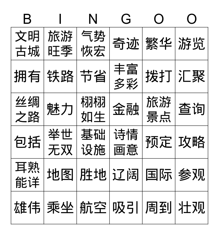 This bingo card has 36 words: 辽阔, 胜地, 吸引, 拥有, 包括, 金融, 铁路, 航空, 繁华, 国际, 汇聚, 奇迹, 参观, 魅力, 丰富多彩, 文明古城, 耳熟能详, 旅游景点, 丝绸之路, 气势恢宏, 栩栩如生, 举世无双, 诗情画意, 基础设施, 预定, 旅游旺季, 拨打, 乘坐, 节省, 游览, 壮观, 雄伟, 攻略, 查询, 地图 and 周到.