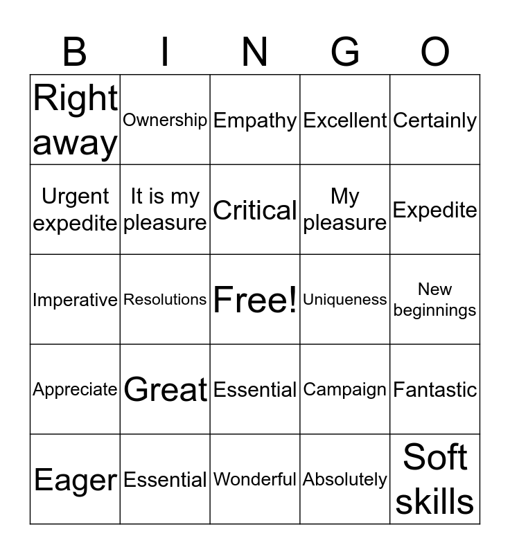 This bingo card has a free space and 28 words: Fantastic, Memorable, My pleasure, Absolutely, Urgent expedite, Empathy, Ownership, Appreciate, Uniqueness, Eager, Imperative, Excellent, Essential, Wonderful, Expedite, Delightful, Great, It is my pleasure, Critical, Essential, Right away, Cita, Soft skills, Resolutions, New beginnings, Campaign, Certainly and Can do.
