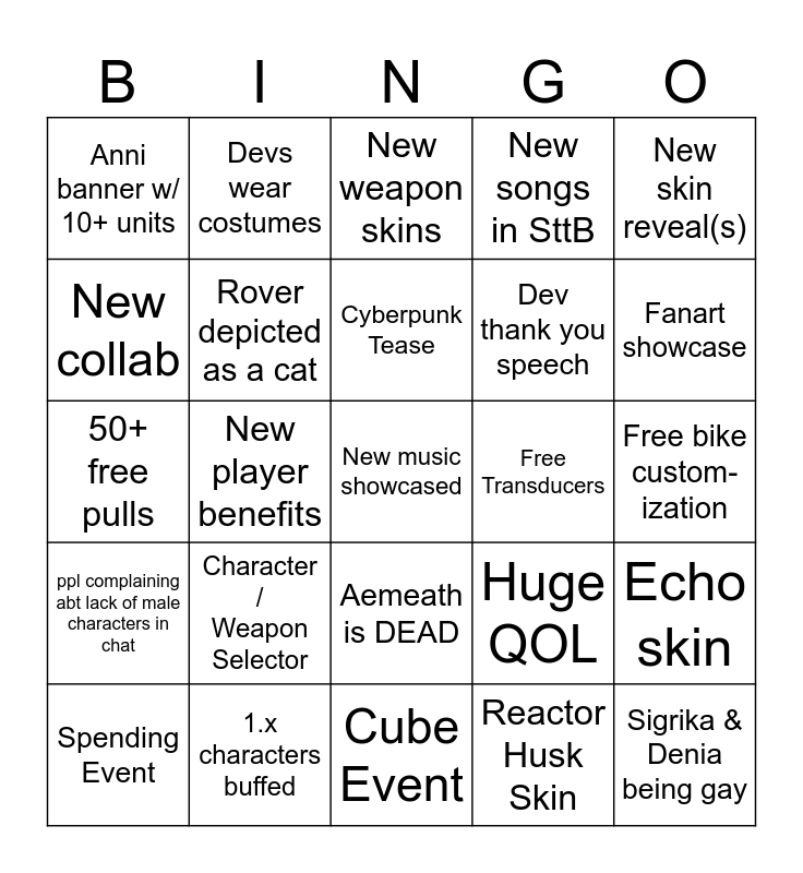 This bingo card has 25 words: Character / Weapon Selector, Cube Event, Cyberpunk Tease, Spending Event, New skin reveal(s), Anni banner w/ 10+ units, New collab, Devs wear costumes, Free Transducers, Aemeath is DEAD, Dev thank you speech, 50+ free pulls, Huge QOL, Echo skin, Rover depicted as a cat, Sigrika & Denia being gay, Free bike custom- ization, New weapon skins, Fanart showcase, New player benefits, New music showcased, 1.x characters buffed, ppl complaining abt lack of male characters in chat, New songs in SttB and Reactor Husk Skin.