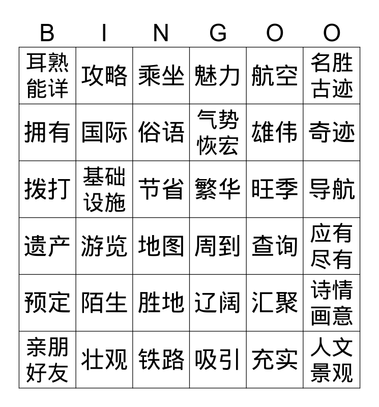 This bingo card has 36 words: 辽阔, 胜地, 吸引, 拥有, 遗产, 繁华, 国际, 铁路, 航空, 汇聚, 奇迹, 魅力, 诗情画意, 基础设施, 气势恢宏, 耳熟能详, 预定, 旺季, 拨打, 乘坐, 节省, 游览, 周到, 地图, 查询, 攻略, 雄伟, 壮观, 俗语, 名胜古迹, 人文景观, 亲朋好友, 应有尽有, 导航, 陌生 and 充实.