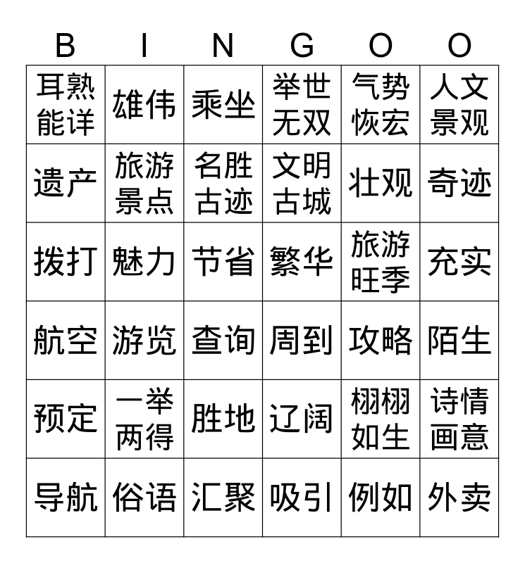 This bingo card has 36 words: 辽阔, 胜地, 吸引, 遗产, 航空, 繁华, 旅游景点, 汇聚, 气势恢宏, 栩栩如生, 奇迹, 举世无双, 诗情画意, 魅力, 文明古城, 耳熟能详, 预定, 旅游旺季, 拨打, 乘坐, 节省, 游览, 周到, 查询, 攻略, 雄伟, 壮观, 俗语, 名胜古迹, 人文景观, 外卖, 导航, 陌生, 充实, 一举两得 and 例如.