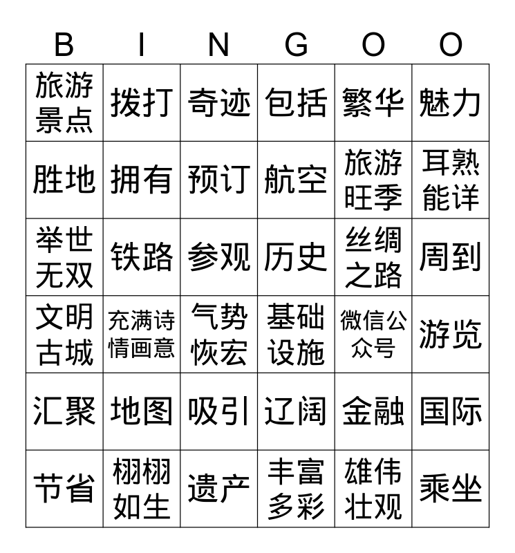 This bingo card has 36 words: 辽阔, 吸引, 丰富多彩, 胜地, 文明古城, 历史, 拥有, 遗产, 繁华, 金融, 耳熟能详, 包括, 国际, 铁路, 航空, 旅游景点, 汇聚, 丝绸之路, 举世无双, 奇迹, 参观, 充满诗情画意, 基础设施, 气势恢宏, 微信公众号, 拨打, 旅游旺季, 栩栩如生, 预订, 魅力, 乘坐, 节省, 游览, 周到, 地图 and 雄伟壮观.