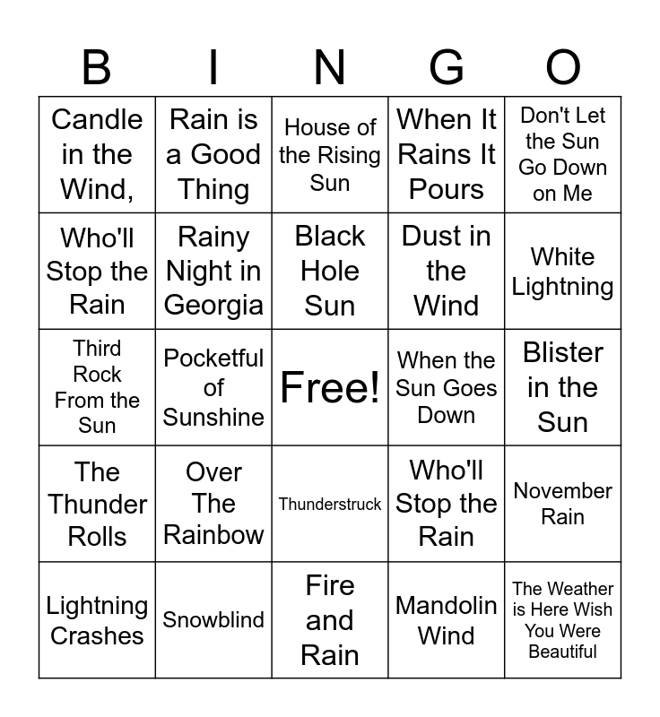 This bingo card has a free space and 48 words: It's Raining Men, The Weather is Here Wish You Were Beautiful, Rain, Fire and Rain, Over The Rainbow, Drops of Jupiter, Rain is a Good Thing, Purple Rain, Who'll Stop the Rain, Rainy Day Woman #12 & 35, Rainy Night in Georgia, When It Rains It Pours, November Rain, Who'll Stop the Rain, Raindrops Keep Falling On My Head, Sunshine, Sunset Grill, Black Hole Sun, When the Sun Goes Down, Walking on Sunshine, Don't Let the Sun Go Down on Me, Pocketful of Sunshine, Mandolin Wind, Candle in the Wind,, Dust in the Wind, Wind Beneath My Wings, White Lightning, Lightning Crashes, Thunder, Thunderstruck, The Thunder Rolls, Thunder Kiss '65, Hurricane, Rock You Like A Hurricane, Tornado, Snowblind, Here Comes the Rain Again, Here Comes the Sun, Blister in the Sun, Ain't Goin Down Til the Sun Comes Up, Seasons in the Sun, Walkin on the Sun, Children of the Sun, House of the Rising Sun, Ain't No Sunshine, Third Rock From the Sun, Sunglasses at Night, Cheap Sunglasses and It's Raining Men, The Weather is Here Wish You Were Beautiful, Rain, Fire and Rain, Over The Rainbow, Drops of Jupiter, Rain is a Good Thing, Purple Rain, Who'll Stop the Rain, Rainy Day Woman #12 & 35, Rainy Night in Georgia, When It Rains It P.