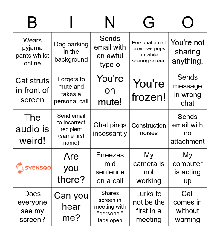 This bingo card has 1 images, a free space and 23 words: Are you there?, Can you hear me?, You're on mute!, Does everyone see my screen?, You're not sharing anything., Wears pyjama pants whilst online, Cat struts in front of screen, Dog barking in the background, Construction noises, Sneezes mid sentence on a call, You're frozen!, The audio is weird!, My camera is not working, My computer is acting up, Forgets to mute and takes a personal call, Lurks to not be the first in a meeting, Sends email with no attachment, Sends email with an awful type-o, Sends message in wrong chat, Send email to incorrect recipient (same first name), Call comes in without warning, Personal email previews pops up while sharing screen and Shares screen in meeting with "personal" tabs open.