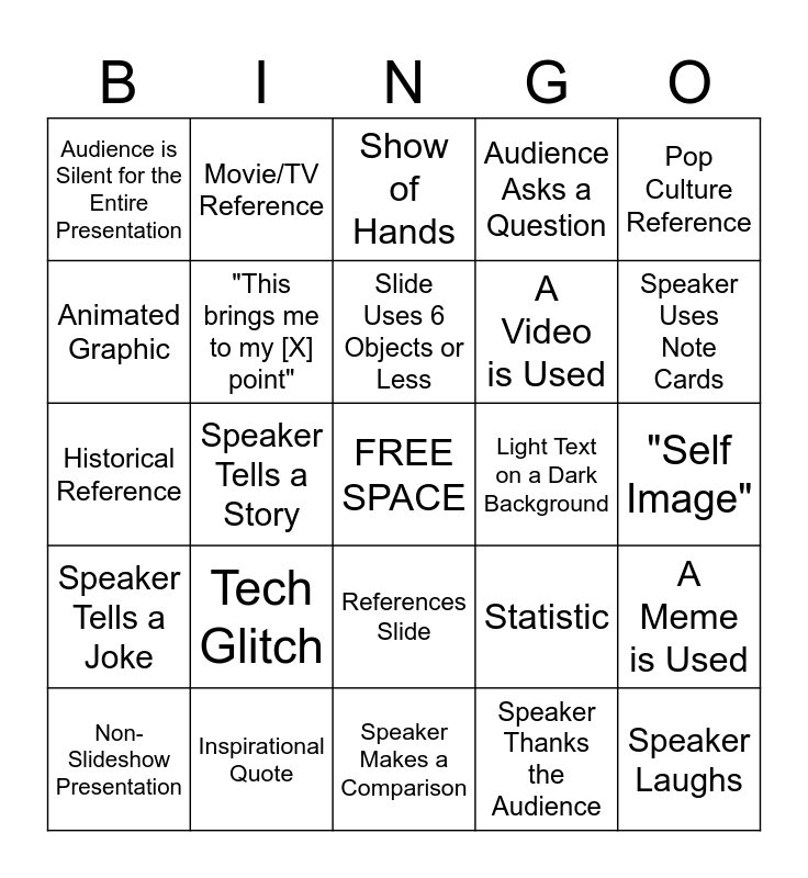 This bingo card has a free space and 39 words: Speaker Uses a Hypothetical, PowerPoint, Song/Artist Reference, "This brings me to my [X] point", Non-Slideshow Presentation, References Slide, Slide Uses 6 Objects or Less, Audience Laughs, Pop Culture Reference, Speaker Tells a Joke, Speaker Tells a Story, Audience Asks a Question, Speaker Laughs, "Self Image", Light Text on a Dark Background, Tech Glitch, Signal Colors: Red, Yellow, Orange, Audience is Silent for the Entire Presentation, Speaker Says "In Conclusion", Statistic, Animated Graphic, Speaker Makes a Comparison, A Video is Used, Speaker Uses Note Cards, A Sound Effect is Used, Slide Delay, Speaker Asks a Question, Social Media Reference, "Depression", Movie/TV Reference, "Anxiety", "Teenagers" or "Adolescents", Show of Hands, Inspirational Quote, Speaker Thanks the Audience, "College Students", A Meme is Used, Historical Reference and "Mental Health".
