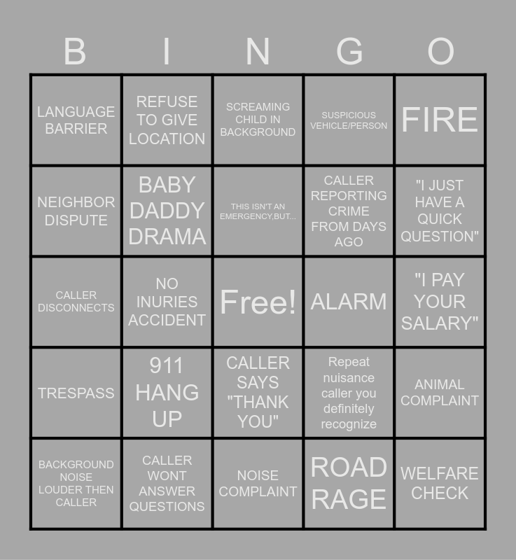 This bingo card has a free space and 24 words: 911 HANG UP, CALLER WONT ANSWER QUESTIONS, THIS ISN'T AN EMERGENCY,BUT..., BACKGROUND NOISE LOUDER THEN CALLER, FIRE, LANGUAGE BARRIER, NEIGHBOR DISPUTE, REFUSE TO GIVE LOCATION, ALARM, CALLER SAYS "THANK YOU", CALLER REPORTING CRIME FROM DAYS AGO, CALLER DISCONNECTS, Repeat nuisance caller you definitely recognize, ANIMAL COMPLAINT, BABY DADDY DRAMA, ROAD RAGE, "I PAY YOUR SALARY", SCREAMING CHILD IN BACKGROUND, "I JUST HAVE A QUICK QUESTION", NO INURIES ACCIDENT, WELFARE CHECK, TRESPASS, SUSPICIOUS VEHICLE/PERSON and NOISE COMPLAINT.
